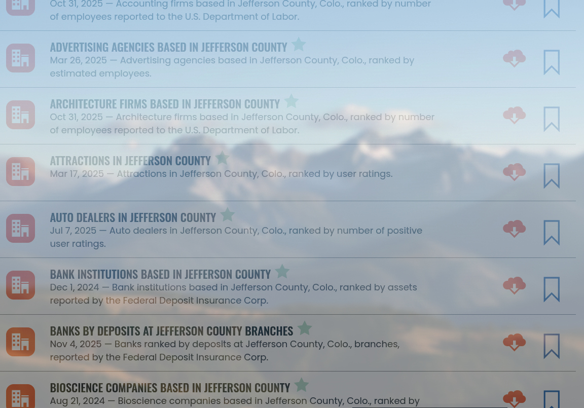 While essential services like Hospitals in Jefferson County (570) and Major Jeffco Employers (299) continue to provide foundational data, the 2025 rankings illustrate a shift toward specialized and growth-oriented directories. Even niche categories such as Splurge Restaurants in Jefferson County (566) and Residential Real Estate Brokerages in Jefferson County (555) outperformed traditional sectors like Accounting Firms based in Jefferson County (344) and Manufacturers based in Jefferson County (176), reflecting a dynamic and multifaceted interest in the local business landscape.