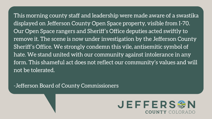 According to a Jefferson Board of County Commissioners statement posted on X, officials in Jefferson County were alerted on Oct. 11 to a swastika displayed on property managed by Jefferson County Open Space, which was visible from I-70. Open Space rangers and deputies from the Sheriff’s Office quickly responded to remove the symbol. The Jefferson…more